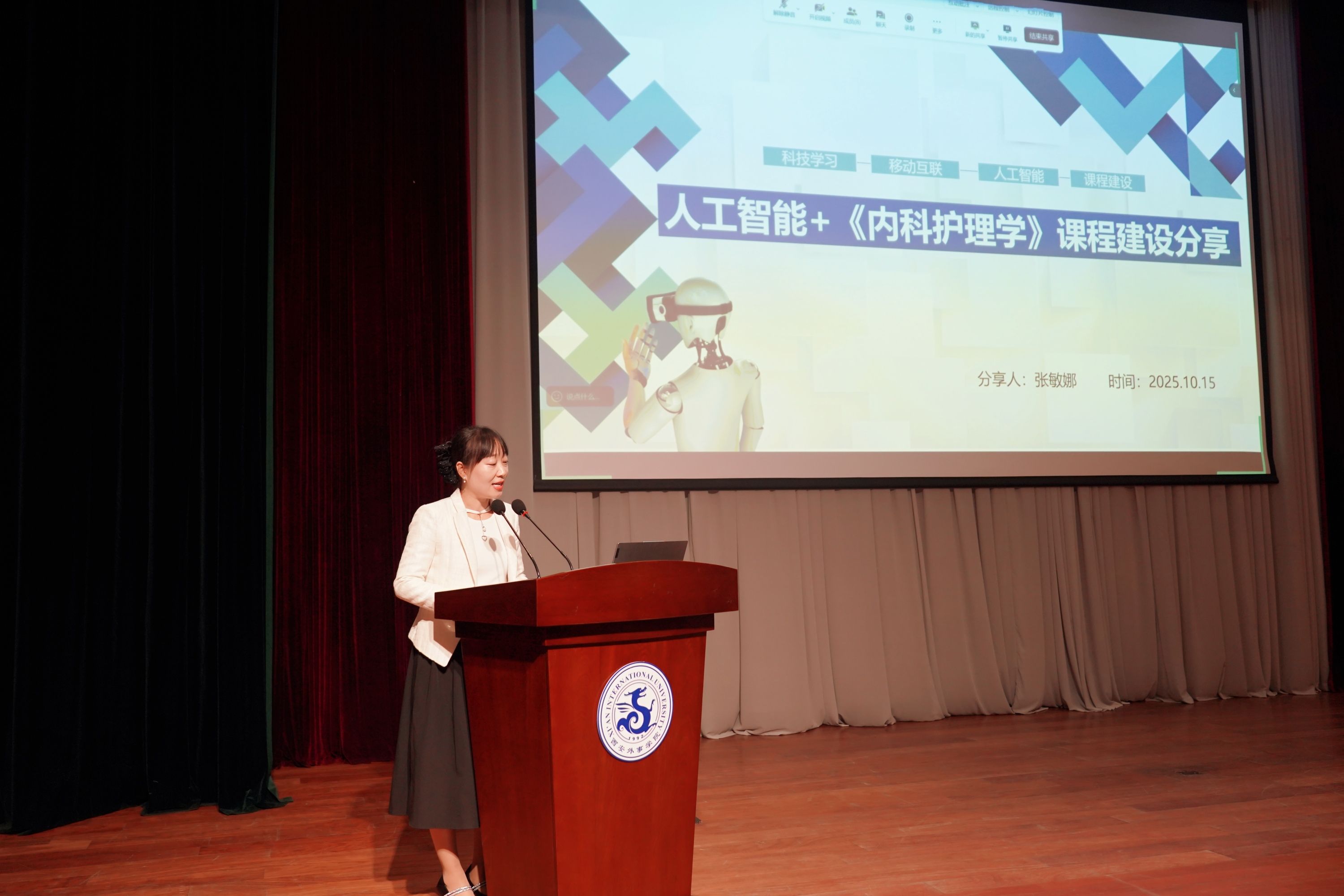 医学院张敏娜老师作《人工智能+〈内科护理学〉课程建设》智慧课程建设分享交流。张老师从建设思路、建设内容与成效、下一步计划、以及经验总结与反思等方面系统展示了所建设的课程亮点。《内科护理学》课程构建了“四位一体”智能教学框架,重点建设知识、问题、能力、思政四大图谱,配备AI助教实现精准答疑与学习跟踪。张老师指出,通过启发式学习助手与AI陪练系统,开展学情分析并推送个性化资源。未来将推动从“知识灌输”到“能力建构”的教学范式变革,构建“教师-AI-学生”高效共生的教育新生态。
