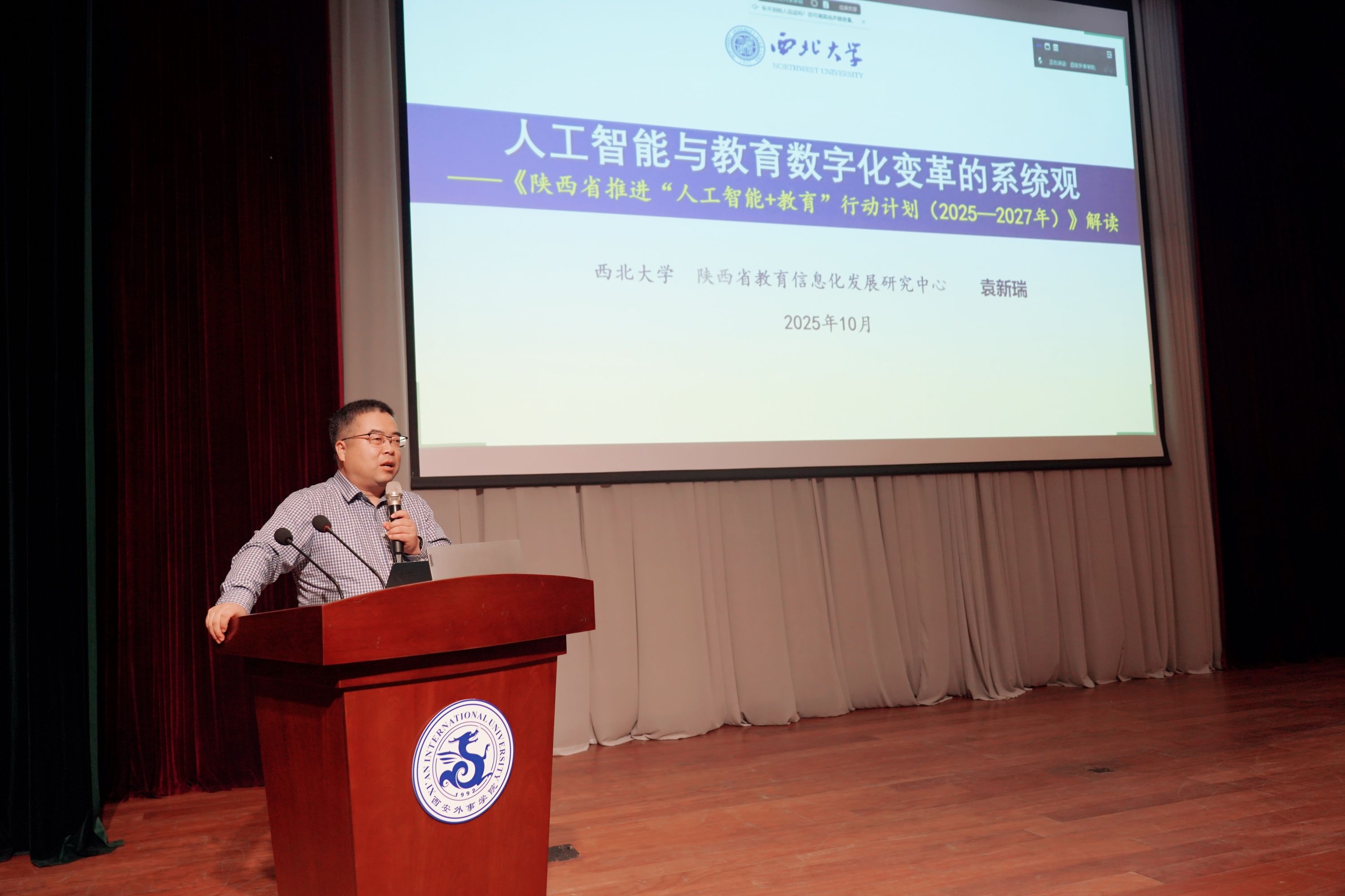 陕西省教育信息化发展研究中心副主任、西北大学高级工程师袁新瑞在分享中系统解读了陕西省《推进“人工智能+教育”行动计划(2025—2027年)》。他为大家明析了“人工智能+教育”的时代背景与变革动因,指出了未来教育系统变革的基本遵循与发展方向,明确了国家战略部署与陕西省行动计划的核心举措,给出了高校对推进“人工智能+教育”的实用建议。强调智课建设要聚焦真实教学问题,坚持以教师为设计核心,遵循教育规律,鼓励教师成长为AI时代的研究型教育者。