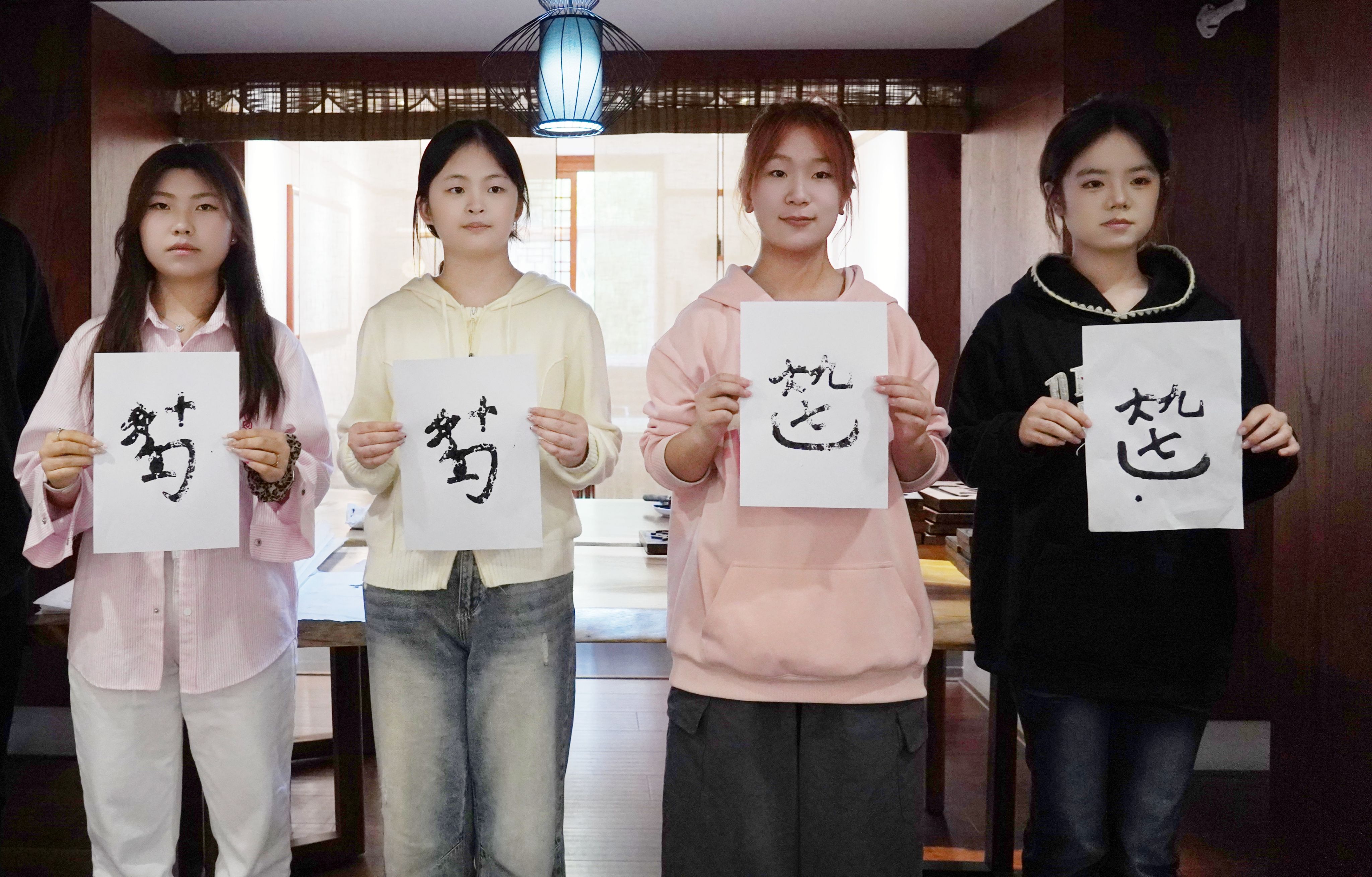 在学习书法环节,看同学们的笔尖在宣纸上游走,墨色浓淡间是中华文化的气韵流转。那笔锋的提按、线条的粗细,都是书法艺术的精妙所在。
