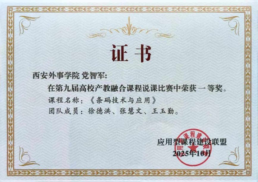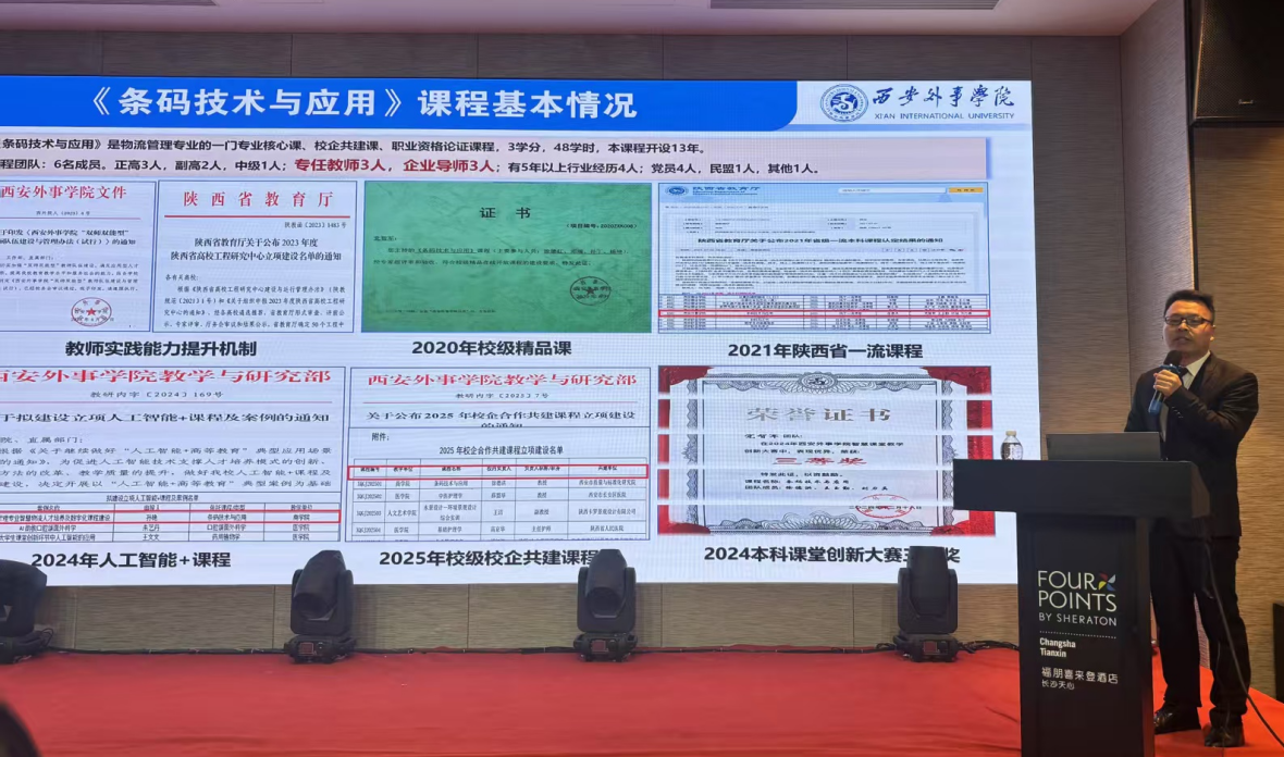 2025年10月25日,从全国应用型课程建设联盟传来好消息,西安外事学院商学院物流与会展经济系党智军副教授代表《条码技术与应用》课程组在第九届高校产教融合课程说课比赛中获得全国一等奖。