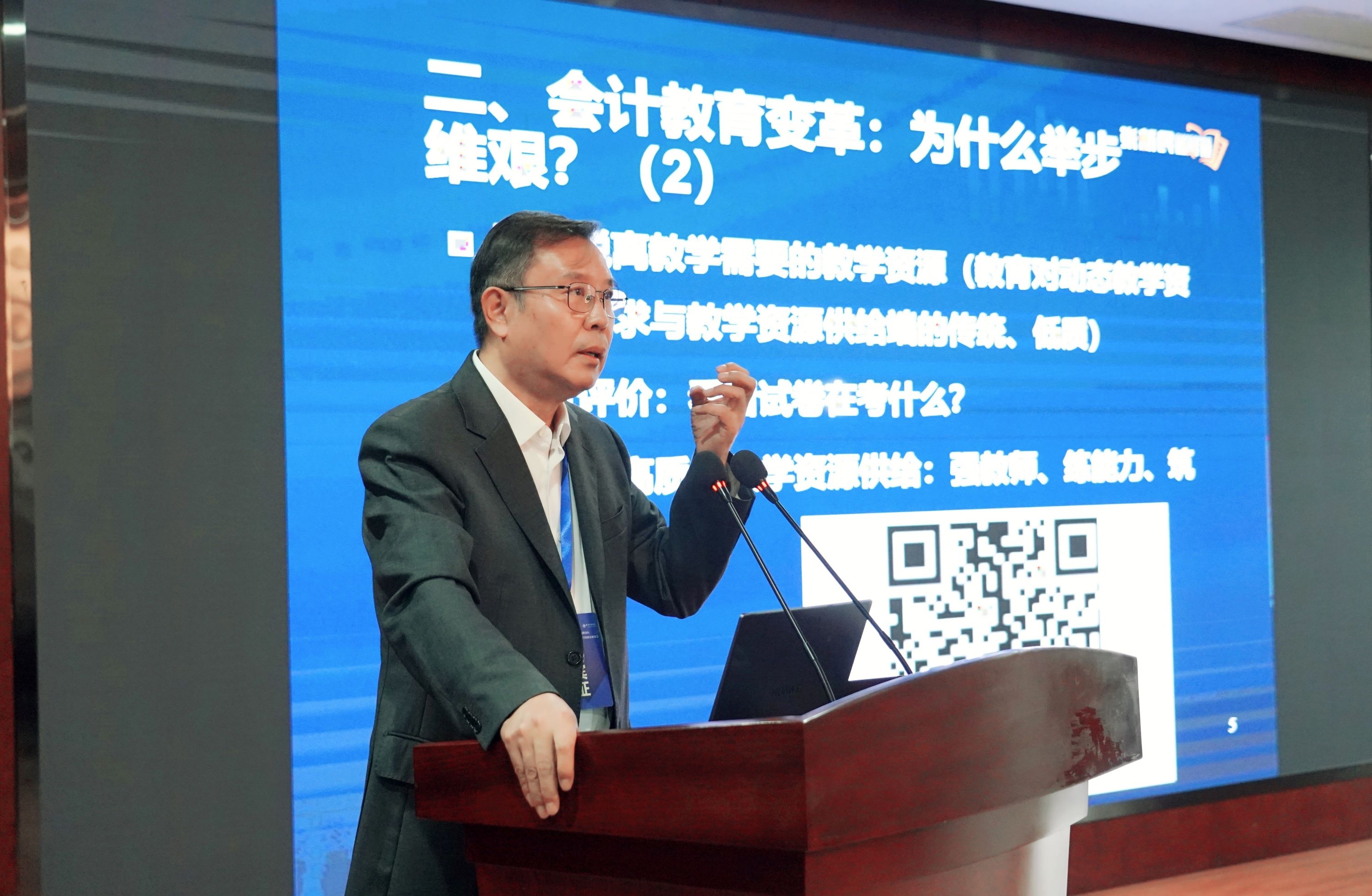 多位专家学者在论坛主旨报告环节先后发表专题演讲,分享前沿研究成果与实践思考。对外经济贸易大学原副校长、中国金融会计学会副会长张新民教授以《“人工智能+”背景下的会计教育》为题,从财务视角深入探讨了企业高质量发展路径与会计教育的转型方向。